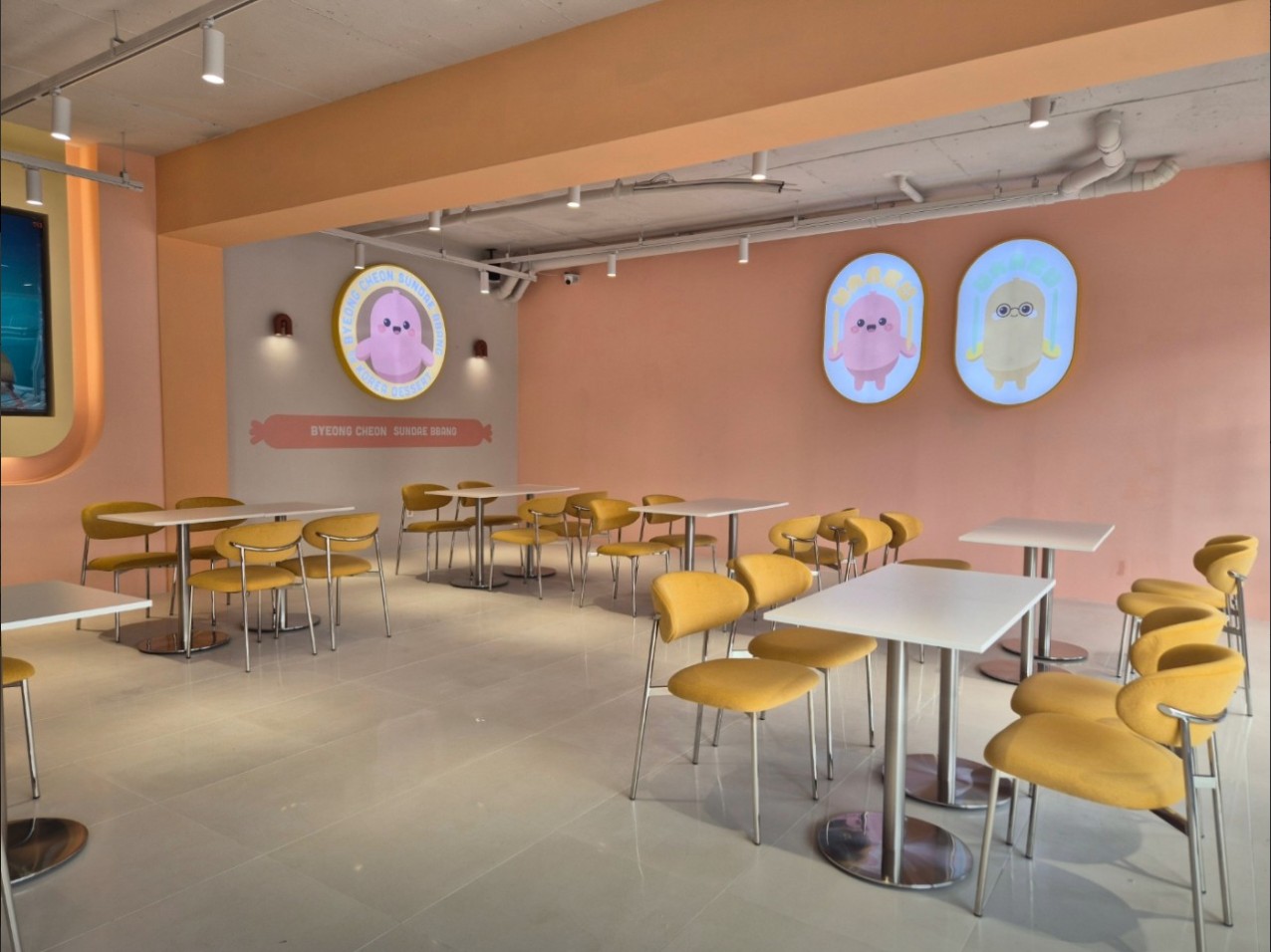 병천순대빵은 일반적인 전통 먹거리점과는 전혀 다른 인상을 줍니다. 알록달록하고 키치한 외관에 귀여운 캐릭터와 굿즈가 곳곳에 배치되어 있어 감성적인 사진을 찍기에 좋은 장소입니다.