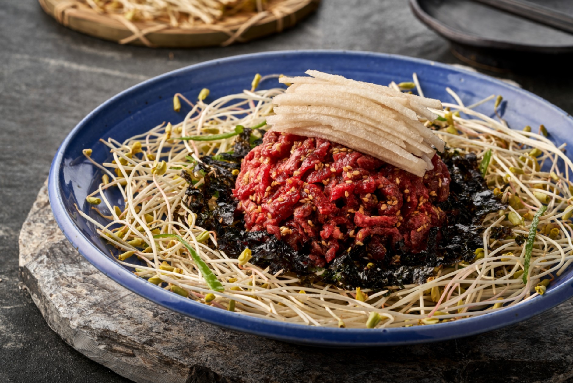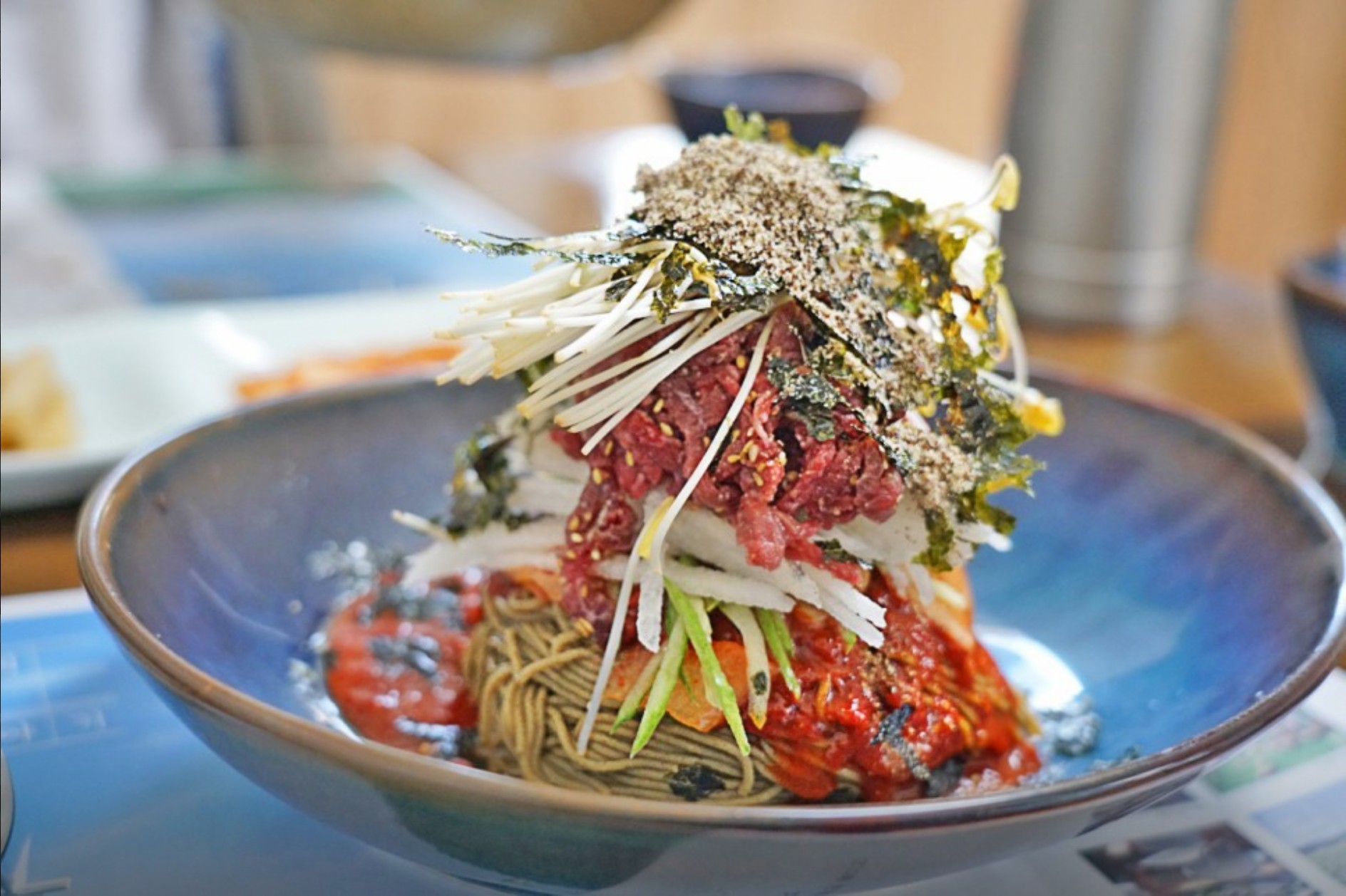 “육회 비빔국수”는 고소한 들깨가루와 메밀싹, 육회의 조화가 훌륭하다는 평가가 많았습니다. 비빔국수를 다 먹고 나서 육수에 면을 적셔 먹으면 또 다른 맛을 느낄 수 있다고 하네요.