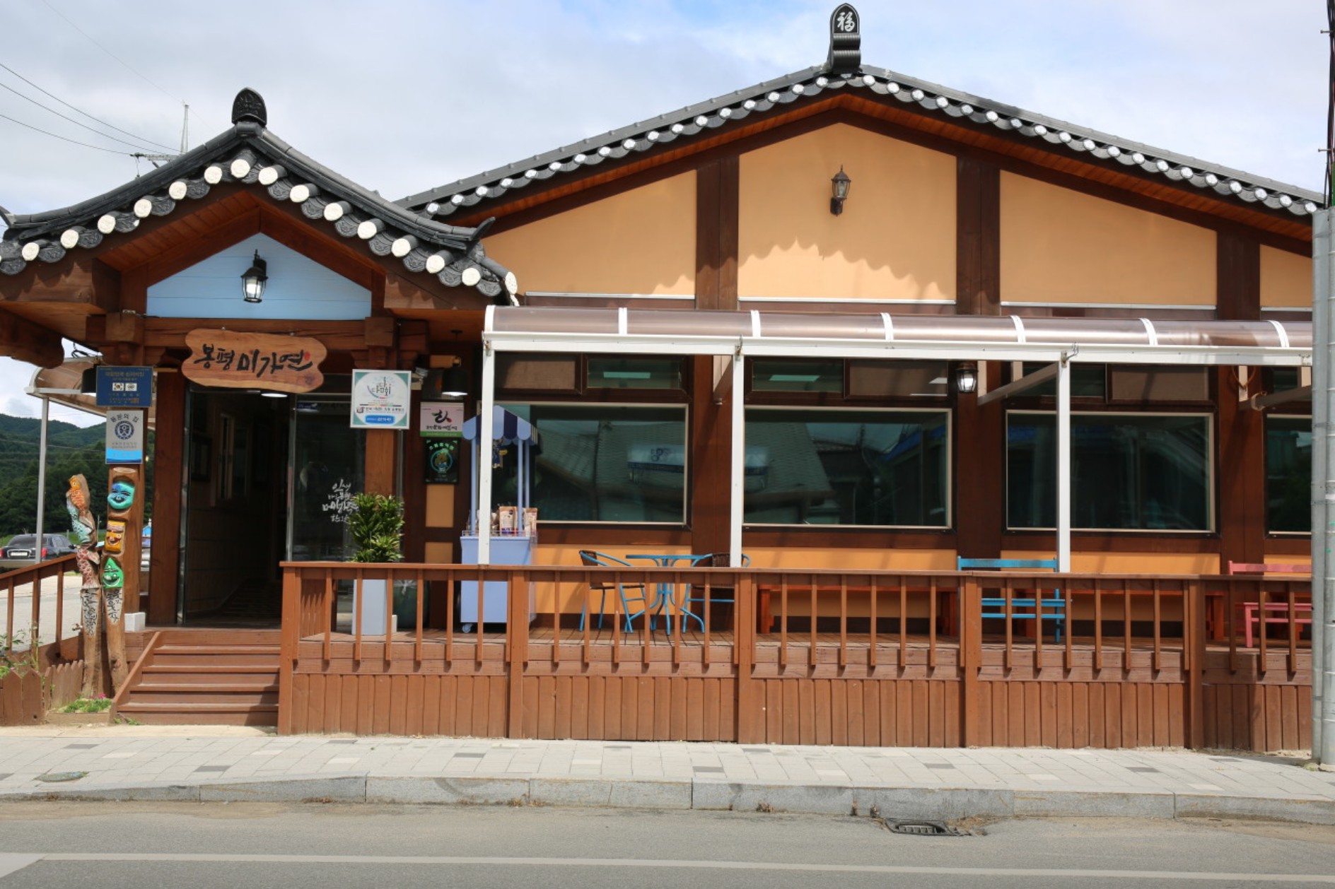 봉평메밀미가연은 외관부터 전통 한옥 느낌을 풍깁니다. 기와지붕이 멋스럽고, 입구에 있는 벤치는 대기 시간 동안 잠시 쉬기에 좋습니다. 내부는 깔끔하고 정갈하게 꾸며져 있는데요.