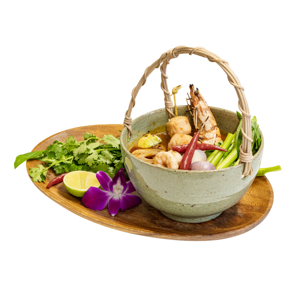태국을 대표하는 새우 수프로, 새콤하고 얼큰한 맛이 조화를 이루는 요리입니다. 레몬그라스, 갈랑갈, 피시소스 등의 허브와 향신료가 들어가 독특한 풍미를 선사하며, 새우의 깊은 감칠맛이 국물에 녹아들어 있습니다.
