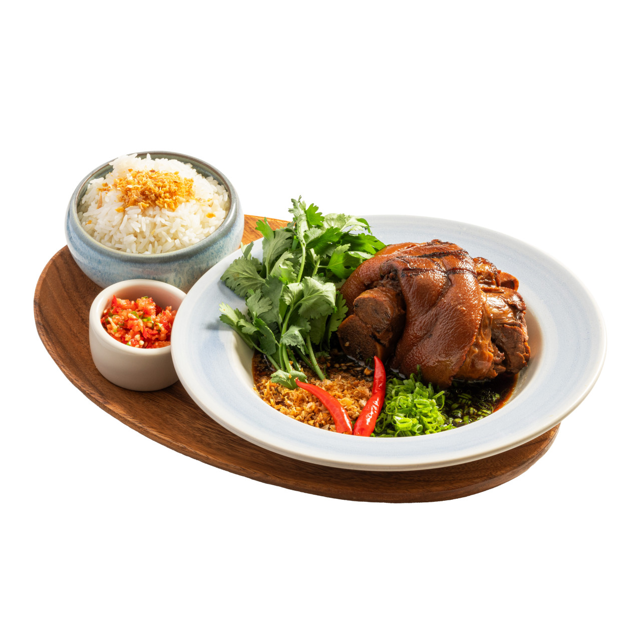 태국식 족발 덮밥인 카오카무는 부드럽게 조리된 돼지고기를 특제 소스와 함께 제공하는 요리입니다. 간장 베이스의 달콤짭짤한 소스가 돼지고기와 밥에 잘 스며들어 한 끼 식사로 든든하게 즐길 수 있습니다.