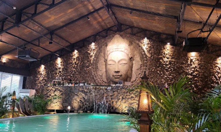 실내에 들어서면 웅장한 태국식 인테리어가 눈길을 사로잡습니다. 중앙에는 넓은 연못이 자리하고 있으며, 벽면에는 거대한 부처 조각상이 장식되어 있습니다. 곳곳에 배치된 푸른 식물들과 태국 전통 장식품들은 이국적인 분위기를 더욱 강조합니다. 공간 자체가 화려하면서도 고급스러운 느낌을 주기 때문에 단순한 식사가 아닌 하나의 여행처럼 느껴지는 곳입니다.
