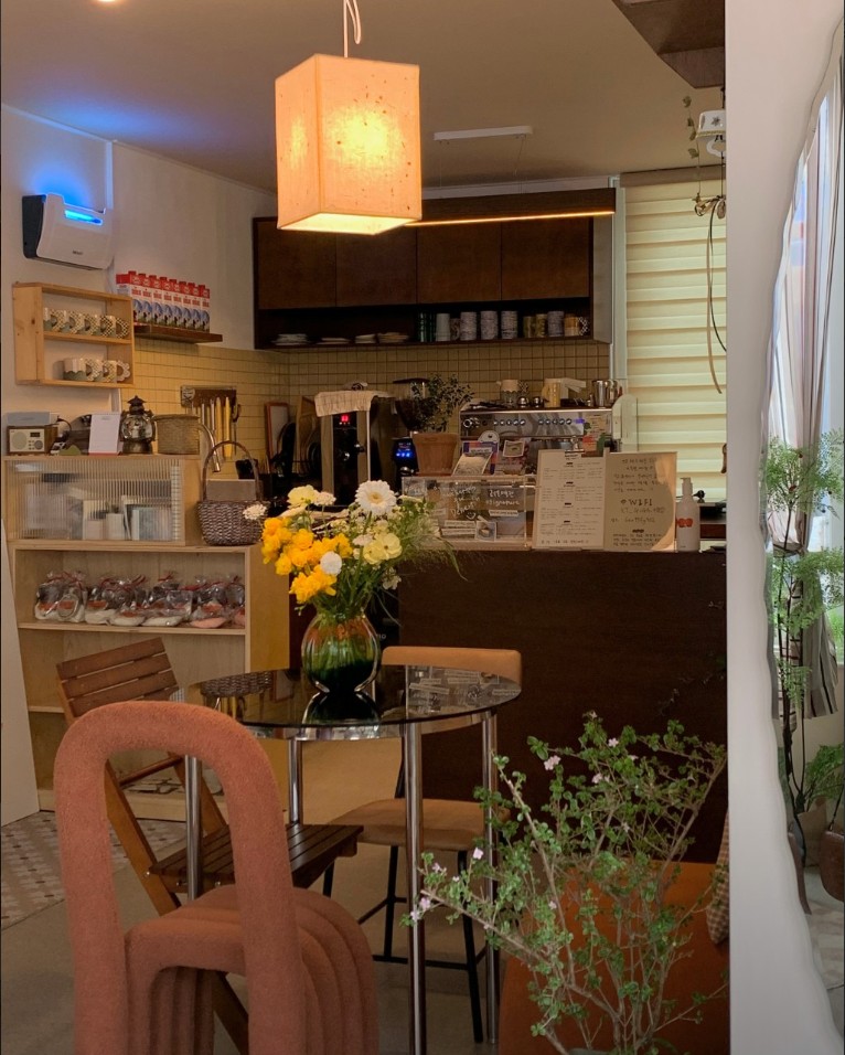 카페는 2층에 자리 잡고 있으며, 내부는 원목 가구와 따뜻한 흙색 벽면으로 꾸며져 있습니다. 천장에는 테라코타 식기걸이가 매달려 있어 자연광을 반사하며 아늑한 분위기를 연출한다고 합니다.